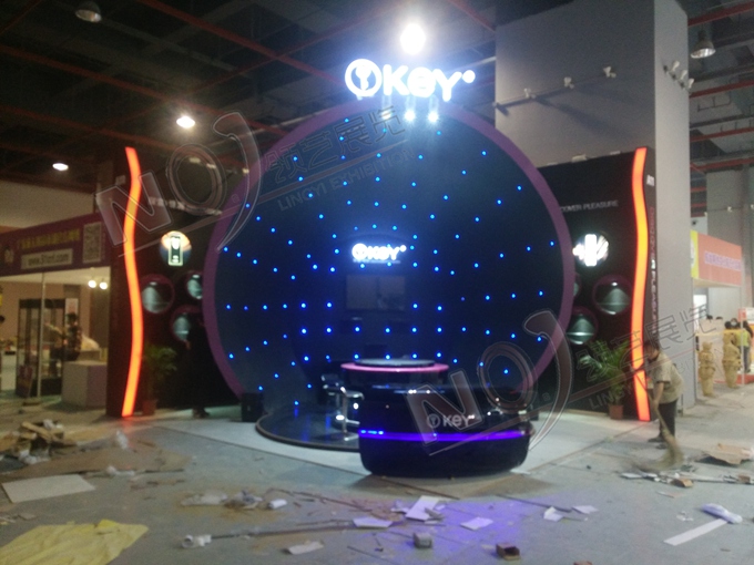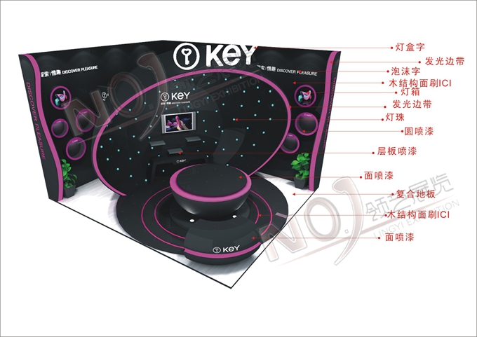 契合KEY的品牌形象和產品特性,采用框型結構,再搭配燈具燈光的效果,襯托出展位浪漫、朦朧的氛圍,突出一種尊貴、躍動的時尚品味。