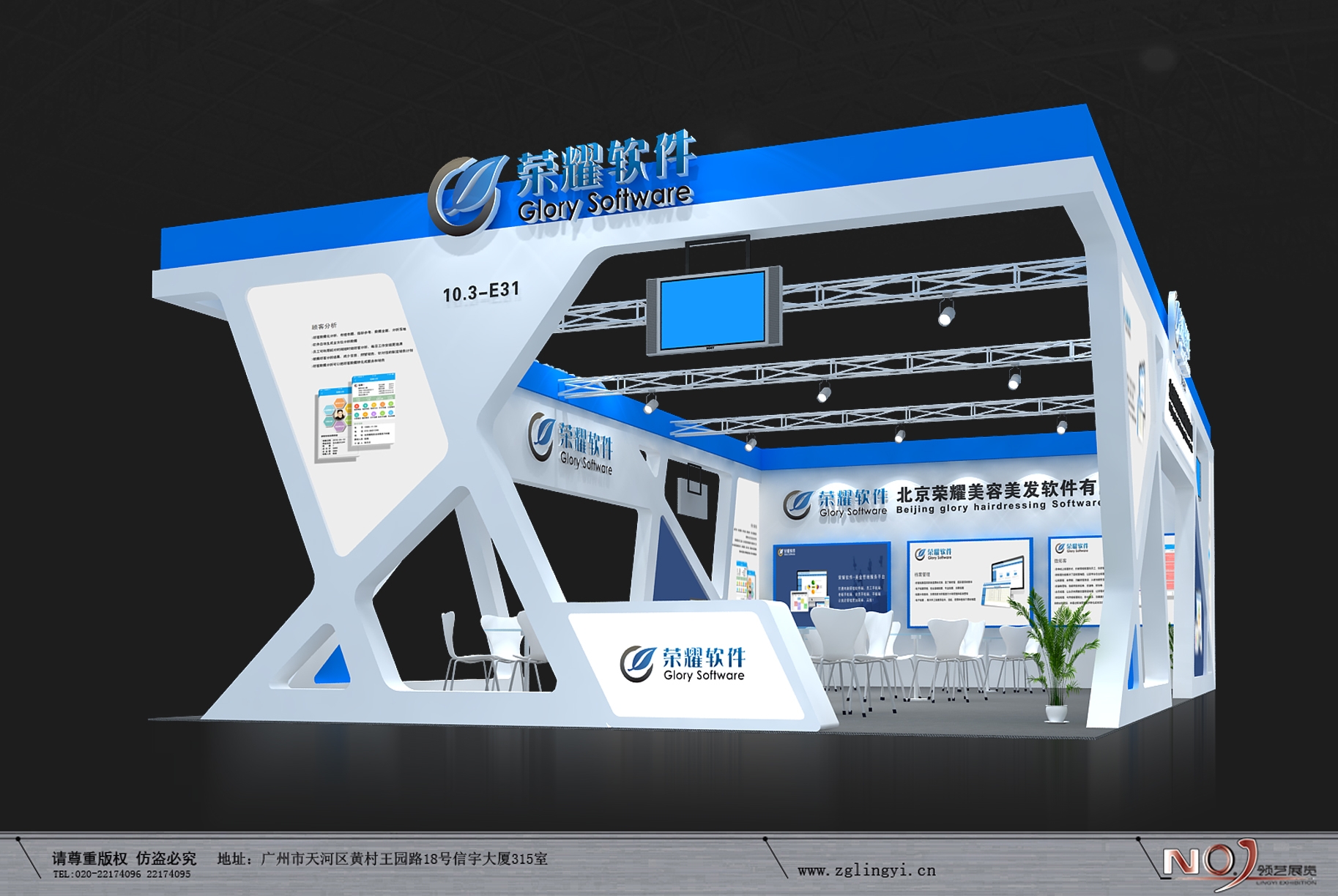 契合榮耀軟件的品牌形象和產(chǎn)品特性,采用線條,再搭配燈具燈光的效果,襯托出展位簡約、舒適的氛圍,突出一種現(xiàn)代、高端的時(shí)尚品味。