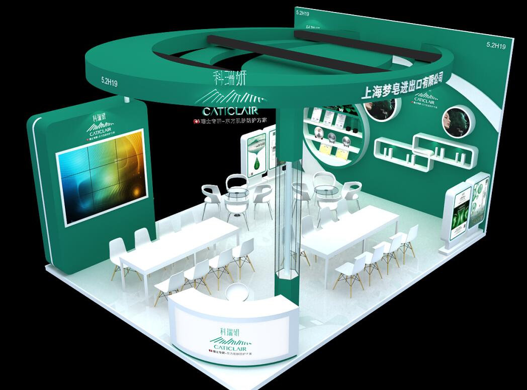 契合上海夢皂品牌形象和產(chǎn)品特性,利用天花造型,再搭配燈具燈光的效果,襯托出展位現(xiàn)代、突出一種現(xiàn)代、高端的時尚品味。