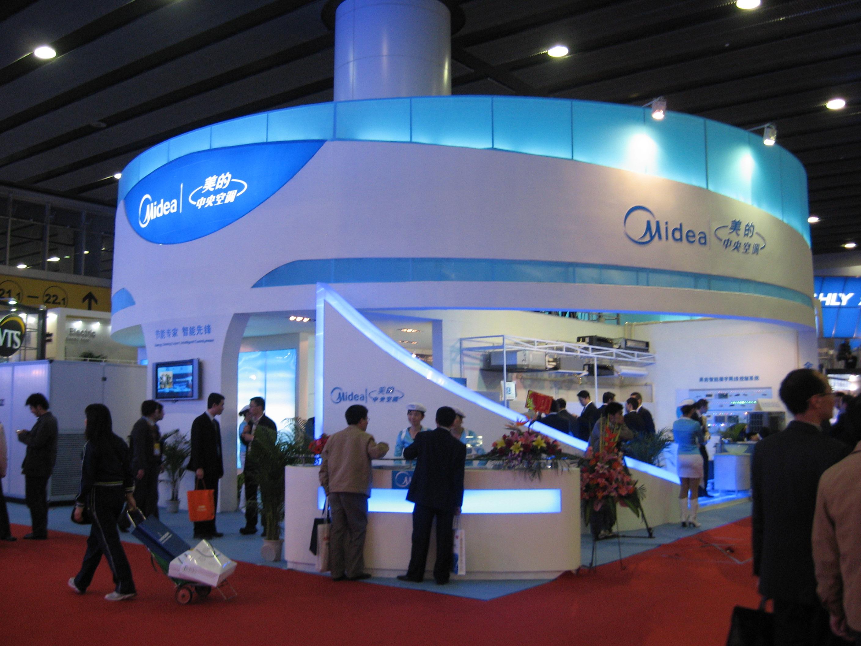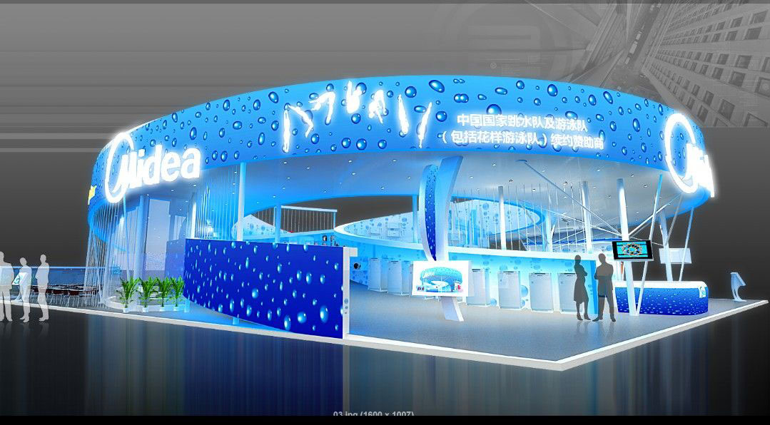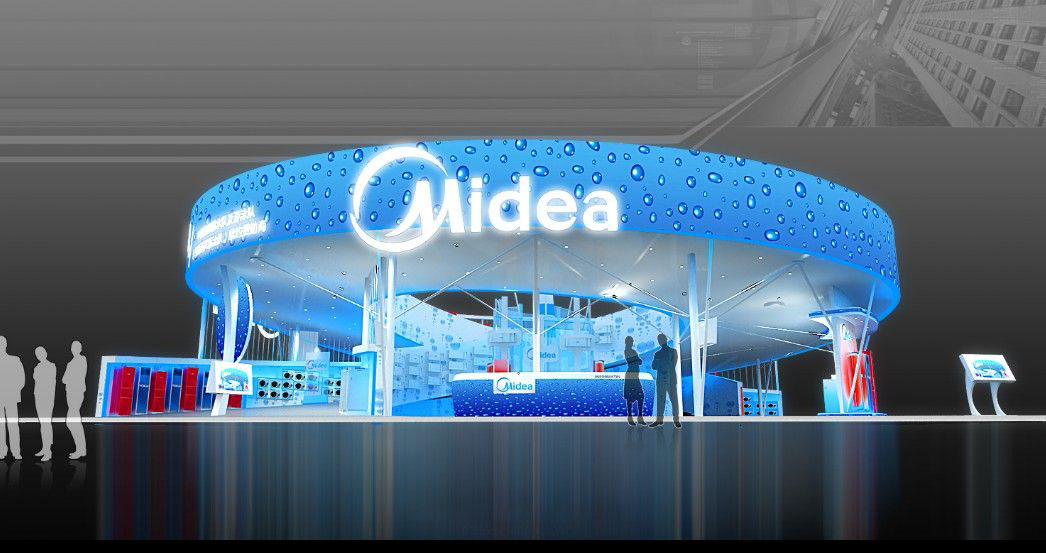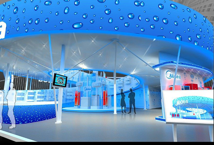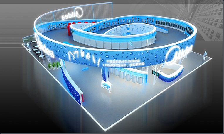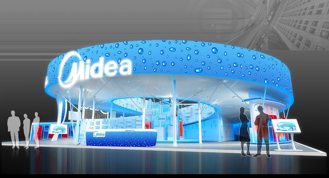 契合美的的品牌形象和產(chǎn)品特性,采用矩形結(jié)構(gòu),再搭配燈具燈光的效果,襯托出展位高端、時(shí)尚的氛圍,突出一種現(xiàn)代、大氣的時(shí)尚品味。