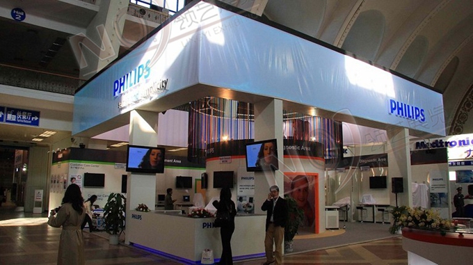 契合的飛利浦品牌形象和產(chǎn)品特性,采用矩形結(jié)構(gòu),再搭配燈具燈光的效果,襯托出展位高端、時(shí)尚的氛圍,突出一種現(xiàn)代、歐美的時(shí)尚品味。