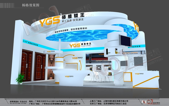 契合楊格鎖業的品牌形象和產品特性,采用弧形、框架結構,再搭配燈具燈光的效果,襯托出展位自由、抽象的氛圍,突出一種簡約、典雅的時尚品味。