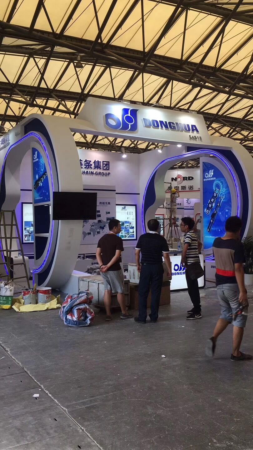 契合東華鏈條的品牌形象和產(chǎn)品特性,采用弧形、矩形結(jié)構(gòu),再搭配燈具燈光的效果,襯托出展位簡約、時尚的氛圍,突出一種現(xiàn)代、簡約的時尚品味。