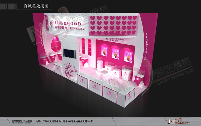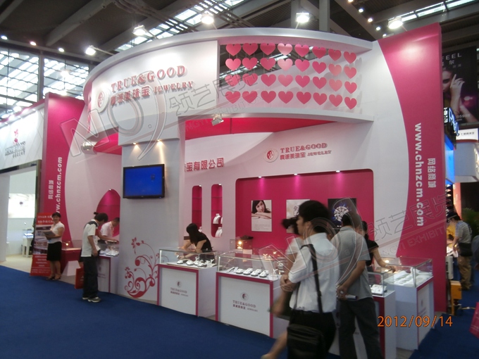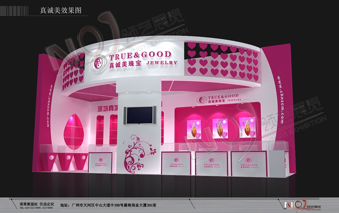 契合真誠美珠寶的品牌形象和產(chǎn)品特性,以弧形結(jié)構(gòu)為主造型,再搭配燈具燈光的效果,襯托出展位絢麗、商務(wù)的氛圍,突出一種典雅、尊貴的時尚品味。