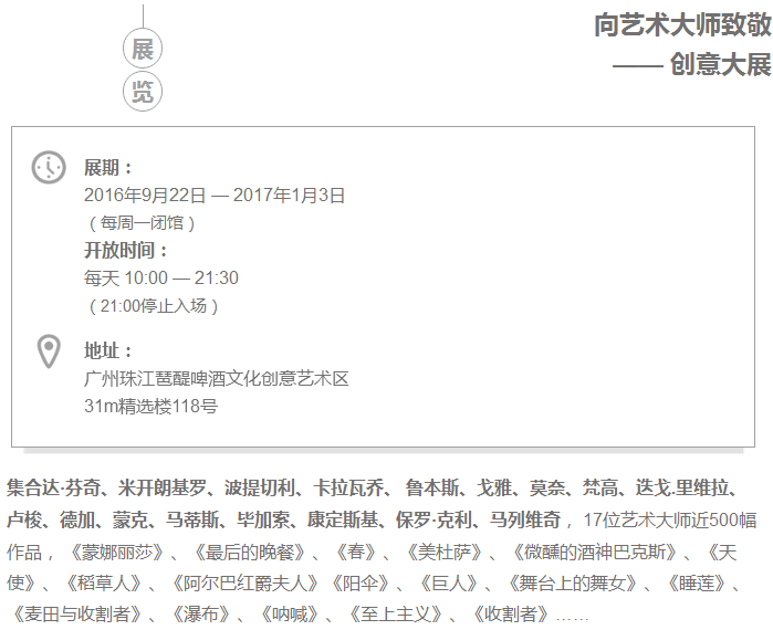 國內知名藝術家共同策展,以專業視角將歐洲14世紀文藝復興時期至當代17位全球最著名的藝術大師作品進行藝術凝練,以創意生動的動態解析方式傳遞國際藝術美學,走進藝術長河,一次看遍西方美術史。