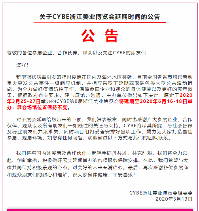 根據美博會設計搭建公司領藝展覽了解到,受疫情影響,原定于2020年3月25-27日舉辦的CYBE第8屆浙江美業博覽會將延期至2020年6月16-18日舉辦,展會場館位置保持不變。如需美博會設計請聯系領藝展覽,希望我們能在美博會搭建上為您添磚加瓦,祝各位朋友收獲多多,滿載而歸!