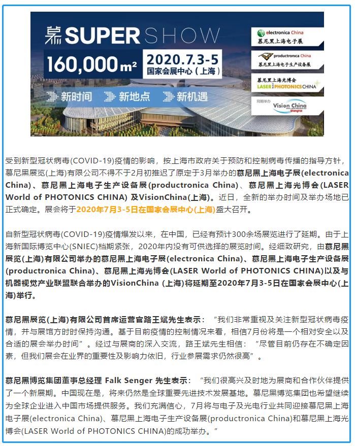 根據上海展會設計搭建公司領藝展覽了解到慕尼黑上海光博會(LASER World of PHOTONICS CHINA) 及VisionChina(上海)。近日,全新的舉辦時間及舉辦場地已正式確定。展會將于2020年7月3-5日在國家會展中心(上海)盛大召開。如需上海展會設計請聯系領藝展覽,希望我們能在上海展會搭建上為您添磚加瓦,祝各位朋友收獲多多,滿載而歸!