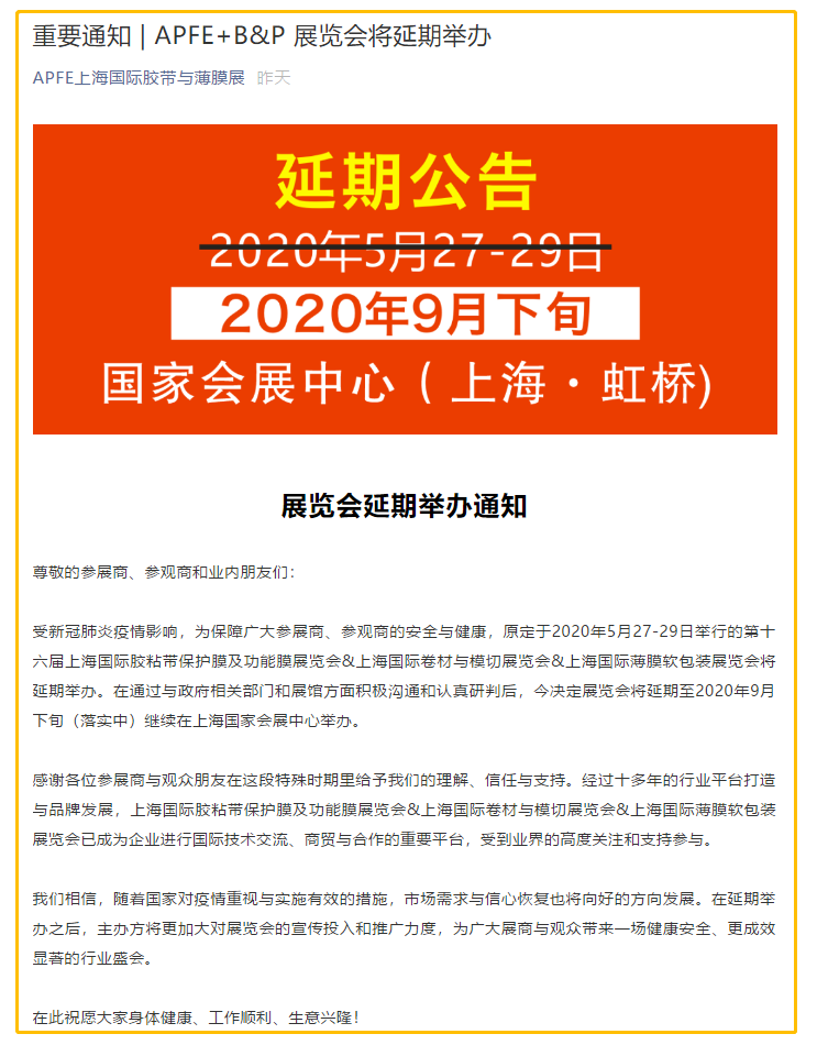 根據上海展臺設計搭建公司領藝展覽了解到,原定于2020年5月27-29日舉行的第十六屆上海國際膠粘帶保護膜及功能膜展覽會&上海國際卷材與模切展覽會&上海國際薄膜軟包裝展覽會將延期舉辦。在通過與政府相關部門和展館方面積極溝通和認真研判后,今決定展覽會將延期至2020年9月下旬(落實中)繼續在上海國家會展中心舉辦。如需上海展會設計請聯系領藝展覽,希望我們能在上海搭建上為您添磚加瓦,祝各位朋友收獲多多,滿載而歸!