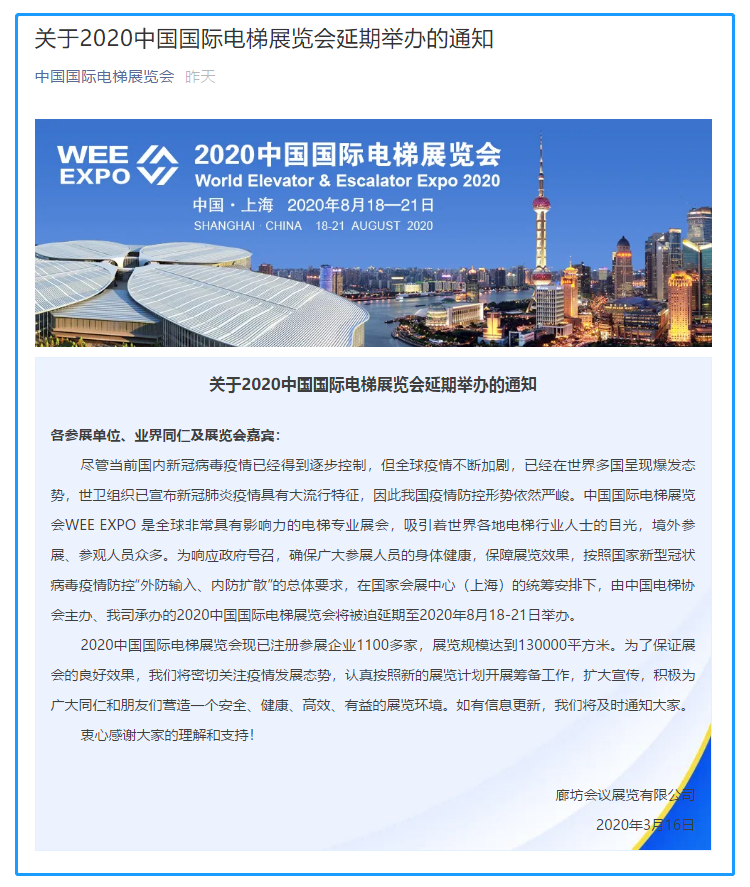 根據電梯展設計搭建公司領藝展覽了解到,為響應政府號召,確保廣大參展人員的身體健康,保障展覽效果,按照國家新型冠狀病毒疫情防控“外防輸入、內防擴散”的總體要求。2020中國國際電梯展覽會將延期至2020年8月18-21日舉辦。如需電梯展展會設計請聯系領藝展覽,希望我們能在電梯展搭建上為您添磚加瓦,祝各位朋友收獲多多,滿載而歸!