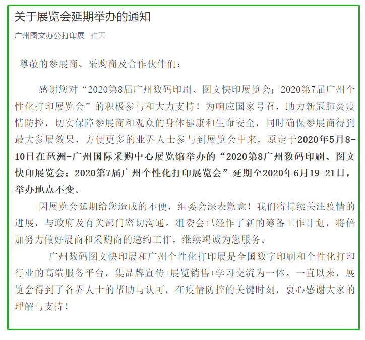 根據廣州展會設計搭建公司領藝展覽了解到,原定于2020年5月8-10日在琶洲-廣州國際采購中心展覽館舉辦的“2020第8廣州數碼印刷、圖文快印展覽會;2020第7屆廣州個性化打印展覽會”延期至2020年6月19-21日,舉辦地點不變。如需廣州展會設計請聯系領藝展覽,希望我們能在廣州展會搭建上為您添磚加瓦,祝各位朋友收獲多多,滿載而歸!