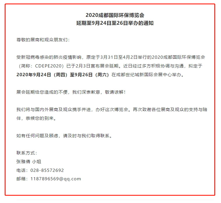 根據成都環博會設計搭建公司領藝展覽了解到,原定于3月31日至4月2日舉行的2020成都國際環保博覽會(簡稱:CDEPE2020)已于2月3日宣布展會延期。近日經過多方積極協調與溝通,擬定于2020年9月24日(周四)至9月26日(周六)在成都世紀城新國際會展中心舉辦。如需環博會設計請聯系領藝展覽,希望我們能在環博會搭建上為您添磚加瓦,祝各位朋友收獲多多,滿載而歸!