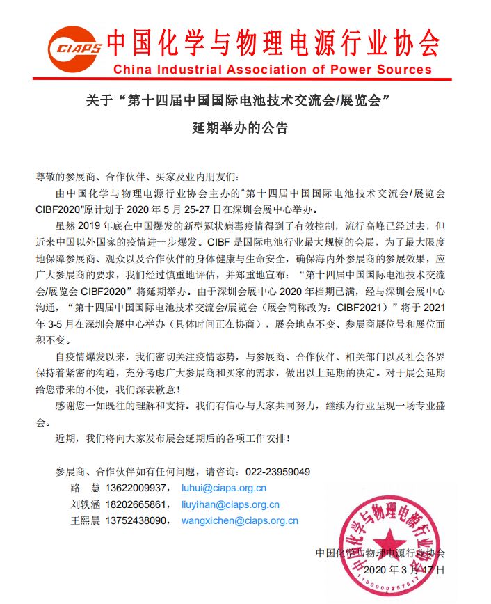 根據電池展設計搭建公司領藝展覽了解到,由中國化學與物理電源行業協會主辦的“第十四屆中國國際電池技術交流會/展覽會CIBF2020"原計劃于2020年5月25-27日在深圳會展中心舉辦。由于深圳會展中心2020年檔期已滿,經與深圳會展中心溝通,“第十四屆中國國際電池技術交流會/展覽會(展會簡稱改為:CIBF2021)”將于2021年3-5月在深圳會展中心舉辦(具體時間正在協商),展會地點不變、參展商展位號和展位面積不變。。如需電池展展會設計請聯系領藝展覽,希望我們能在電池展搭建上為您添磚加瓦,祝各位朋友收獲多多,滿載而歸!