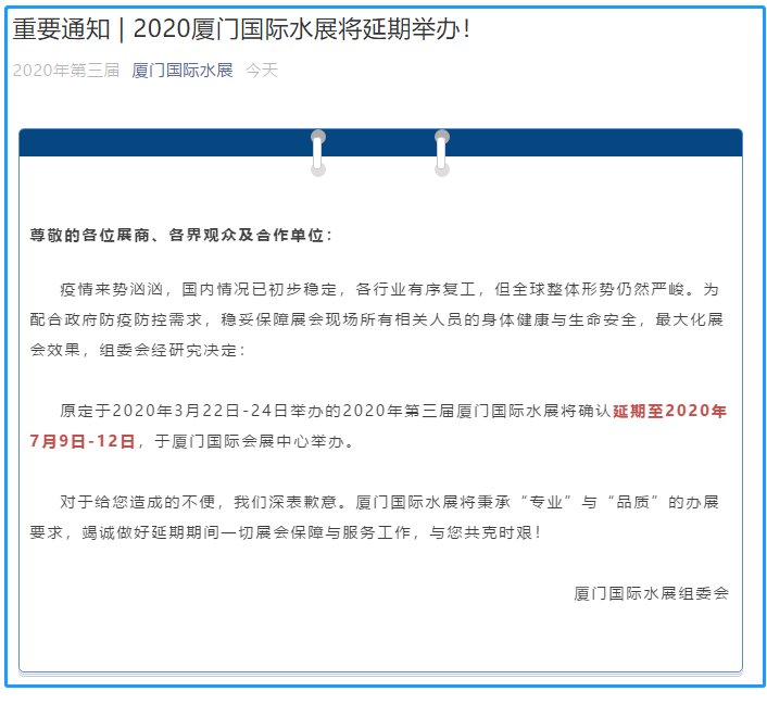 根據廈門水展設計搭建公司領藝展覽了解到,原定于2020年3月22日-24日舉辦的2020年第三屆廈門國際水展將確認延期至2020年7月9日-12日,于廈門國際會展中心舉辦。如需廈門水展設計請聯系領藝展覽,希望我們能在廈門水展搭建上為您添磚加瓦,祝各位朋友收獲多多,滿載而歸!