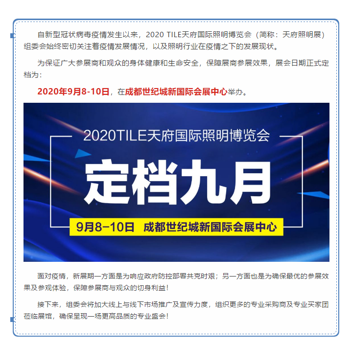 根據成都照明展設計搭建公司領藝展覽了解到,為保證廣大參展商和觀眾的身體健康和生命安全,保障展商參展效果,展會日期正式定檔為:2020年9月8-10日,在成都世紀城新國際會展中心舉辦。如需照明展設計請聯系領藝展覽,希望我們能在照明展搭建上為您添磚加瓦,祝各位朋友收獲多多,滿載而歸!