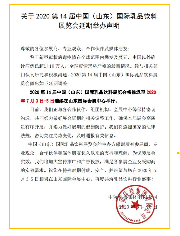 根據乳品飲料展設計搭建公司領藝展覽了解到,2020第14屆中國(山東)國際乳品飲料展覽會將推遲至2020年7月3日-5日繼續在山東國際會展中心舉行。如需乳品飲料展設計請聯系領藝展覽,希望我們能在乳品飲料展搭建上為您添磚加瓦,祝各位朋友收獲多多,滿載而歸!