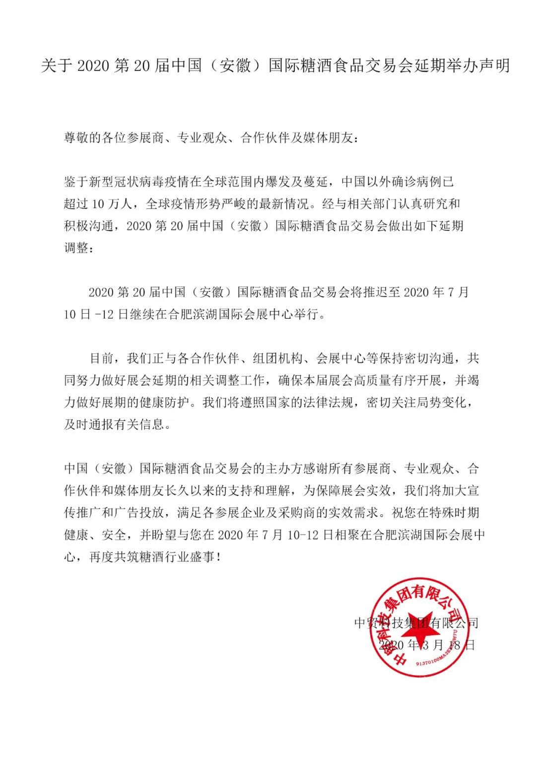 根據糖酒會設計搭建公司領藝展覽了解到,2020第20屆中國(安徽)國際糖酒食品交易會將延期舉辦。如需糖酒會展會設計請聯系領藝展覽,希望我們能在糖酒會搭建上為您添磚加瓦,祝各位朋友收獲多多,滿載而歸!