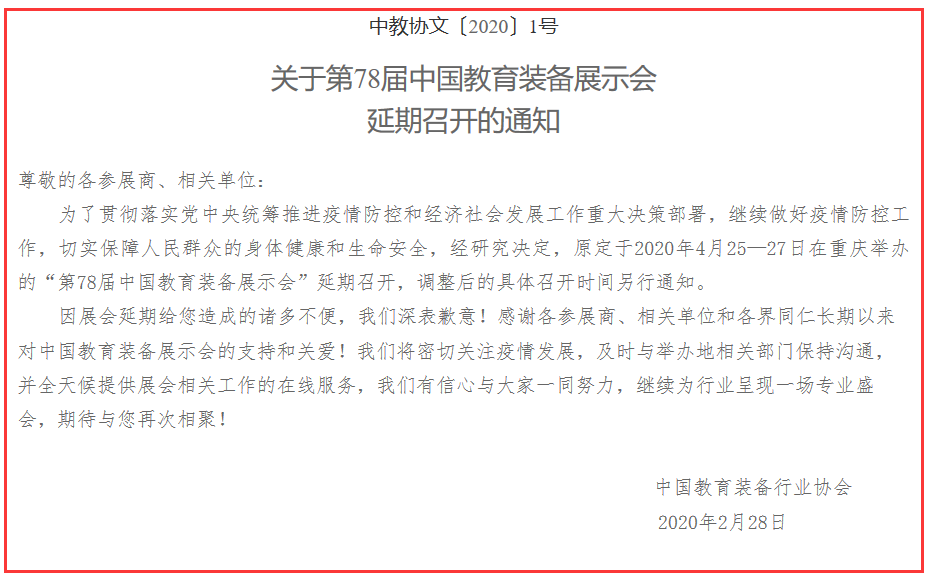 根據(jù)重慶教育展設(shè)計搭建公司領(lǐng)藝展覽了解到,為了貫徹落實黨中央統(tǒng)籌推進(jìn)疫情防控和經(jīng)濟(jì)社會發(fā)展工作重大決策部署,繼續(xù)做好疫情防控工作,切實保障人民群眾的身體健康和生命安全,經(jīng)研究決定,原定于2020年4月25—27日在重慶舉辦的“第78屆中國教育裝備展示會”延期召開,調(diào)整后的具體召開時間另行通知。如需重慶教育展設(shè)計請聯(lián)系領(lǐng)藝展覽,希望我們能在重慶教育展搭建上為您添磚加瓦,祝各位朋友收獲多多,滿載而歸!