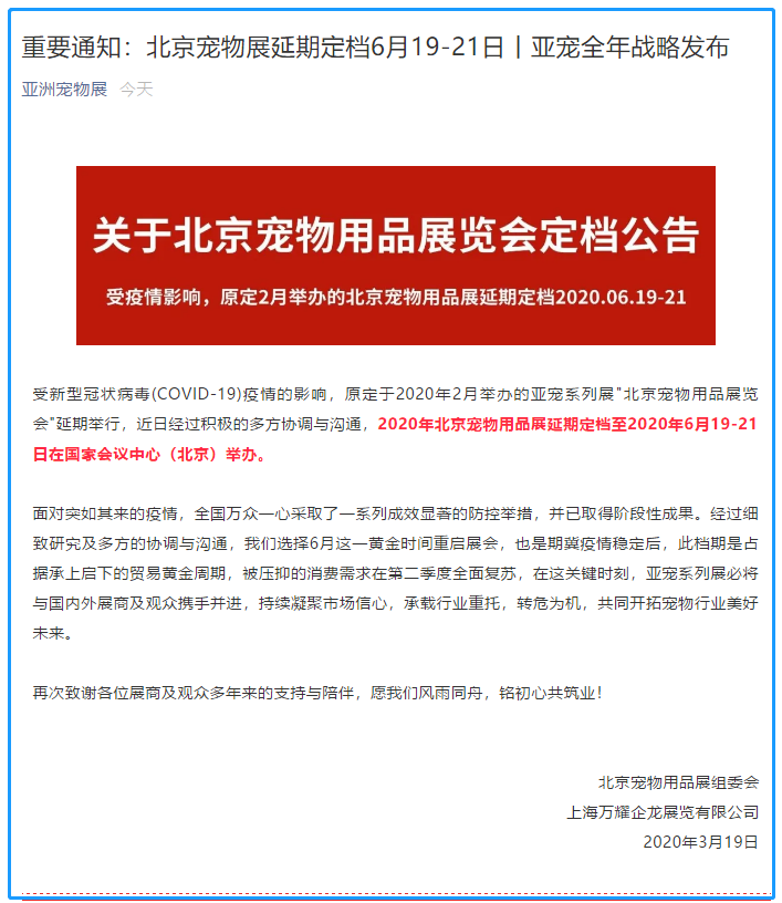 根據(jù)寵物展設(shè)計(jì)搭建公司領(lǐng)藝展覽了解到,原定于2020年2月舉辦的亞寵系列展"北京寵物用品展覽會(huì)"延期舉行,近日經(jīng)過(guò)積極的多方協(xié)調(diào)與溝通,2020年北京寵物用品展延期定檔至2020年6月19-21日在國(guó)家會(huì)議中心(北京)舉辦。如需寵物展展會(huì)設(shè)計(jì)請(qǐng)聯(lián)系領(lǐng)藝展覽,希望我們能在寵物展搭建上為您添磚加瓦,祝各位朋友收獲多多,滿載而歸!