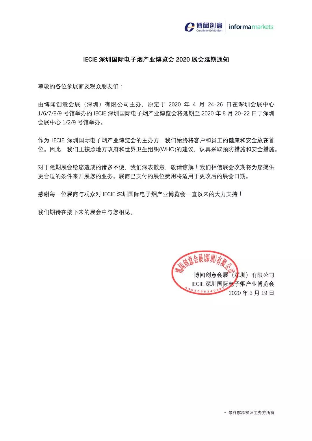 根據(jù)電子煙展設(shè)計搭建公司領(lǐng)藝展覽了解到,原定于2020年4月24日—26日的2020深圳國際電子煙產(chǎn)業(yè)博覽會將延期至2020年8月20日—22日舉辦, 展會地點為深圳會展中心(福田區(qū))1/2/9號館。如需電子煙展設(shè)計請聯(lián)系領(lǐng)藝展覽,希望我們能在電子煙展搭建上為您添磚加瓦,祝各位朋友收獲多多,滿載而歸!
