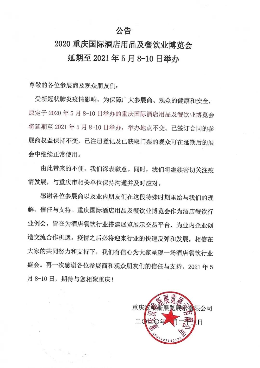 根據(jù)酒店用品展設(shè)計(jì)搭建公司領(lǐng)藝展覽了解到,受新冠狀肺炎疫情影響,為保障廣大參展商、觀眾的健康和安全,原定于2020年5月8-10日舉辦的重慶國(guó)際酒店用品及餐飲業(yè)博覽會(huì)將延期至2021年5月8-10日舉辦,舉辦地點(diǎn)不變。如需酒店用品展設(shè)計(jì)請(qǐng)聯(lián)系領(lǐng)藝展覽,希望我們能在酒店用品展搭建上為您添磚加瓦,祝各位朋友收獲多多,滿載而歸!