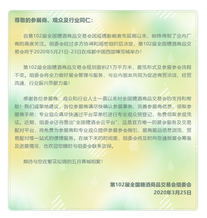 根據(jù)糖酒會(huì)設(shè)計(jì)搭建公司領(lǐng)藝展覽了解到,受新型冠狀病毒疫情防控影響。為全力做好新型冠狀病毒感染肺炎疫情防控工作,為了響應(yīng)及配合疫情防控工作,確保各參展商及觀眾的健康安全,2020年第102屆全國(guó)春季糖酒會(huì)將于5月21-24日在成都西部國(guó)際博覽城舉行。如需糖酒會(huì)設(shè)計(jì)請(qǐng)聯(lián)系領(lǐng)藝展覽,希望我們能在糖酒會(huì)搭建上為您添磚加瓦,祝各位朋友收獲多多,滿載而歸!