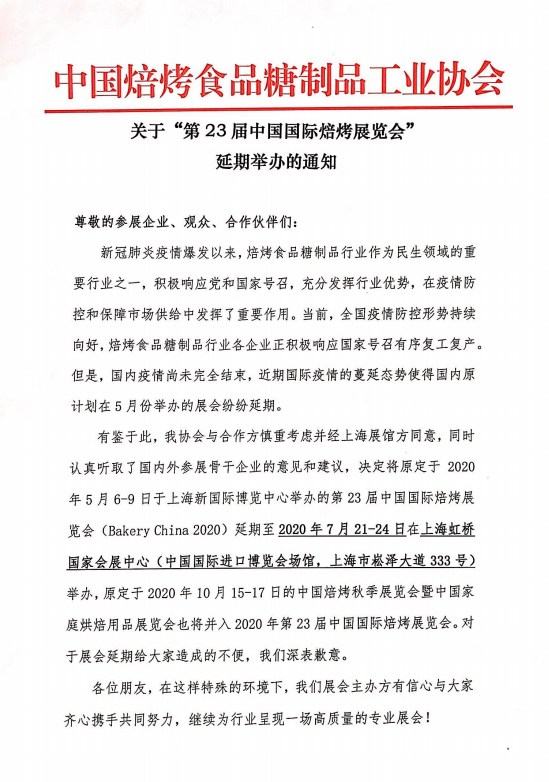 根據(jù)烘焙展設(shè)計(jì)搭建公司領(lǐng)藝展覽了解到,第23屆中國國際焙烤展覽會(原定于2020年5月6-9日于上海新國際博覽中心舉辦)將延期至2020年7月21-24日在上海虹橋國家會展中心(中國國際進(jìn)口博覽會場館,上海市崧澤大道333號)舉辦。如需烘焙展設(shè)計(jì)請聯(lián)系領(lǐng)藝展覽,希望我們能在烘焙展搭建上為您添磚加瓦,祝各位朋友收獲多多,滿載而歸!