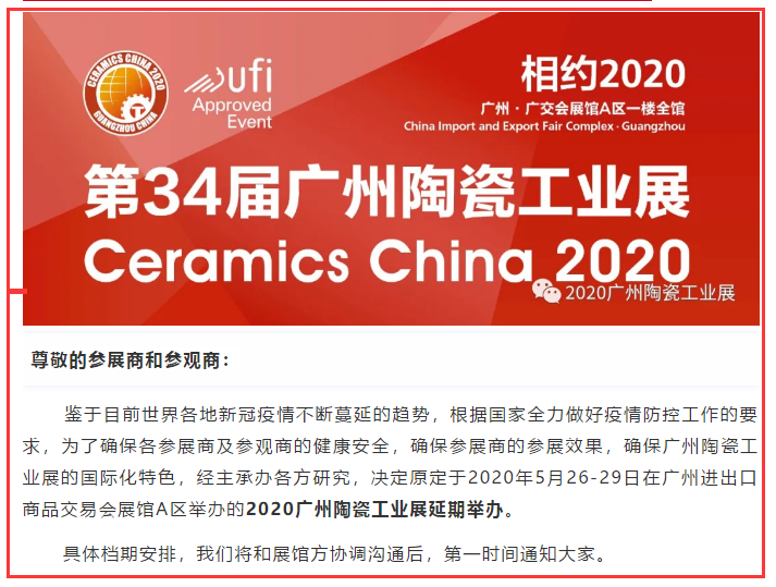 根據陶瓷展設計搭建公司領藝展覽了解到,原定于2020年5月26-29日在廣州進出口商品交易會展館A區(qū)舉辦的2020廣州陶瓷工業(yè)展延期舉辦。如需陶瓷展設計請聯(lián)系領藝展覽,希望我們能在陶瓷展搭建上為您添磚加瓦,祝各位朋友收獲多多,滿載而歸!