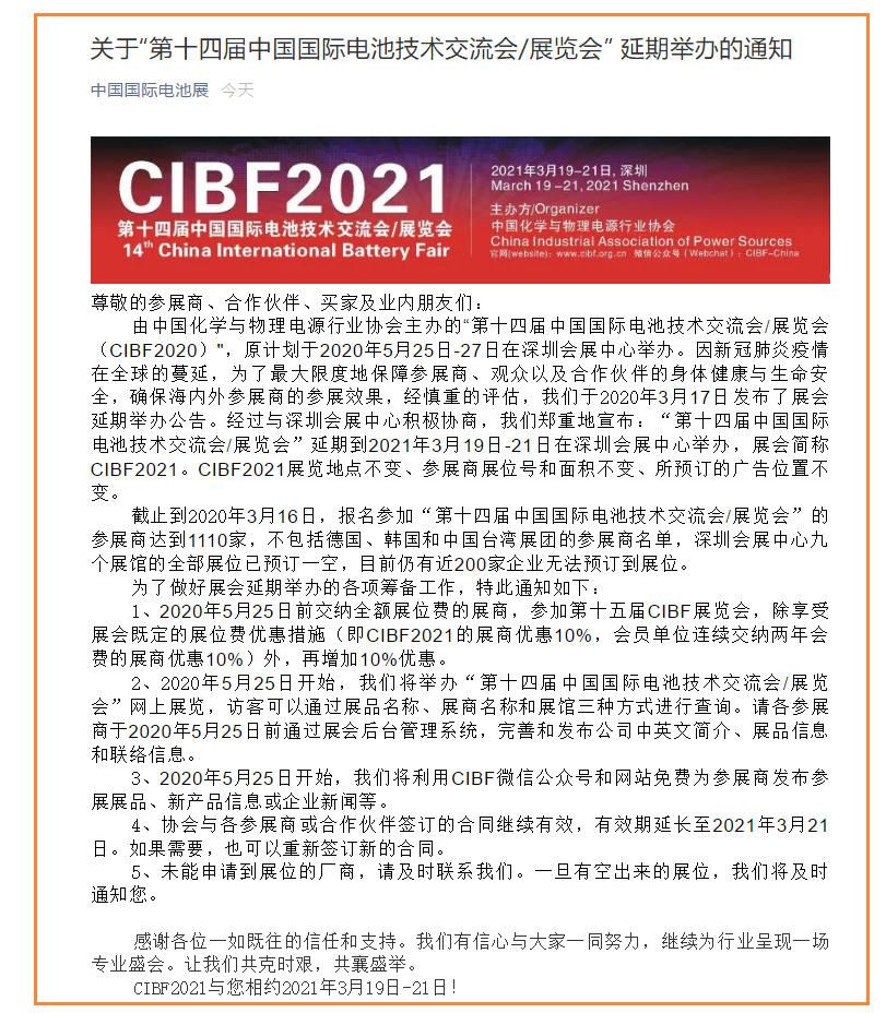 根據(jù)電池展設(shè)計(jì)搭建公司領(lǐng)藝展覽了解到,原計(jì)劃于2020年5月25日-27日在深圳會展中心舉辦。因新冠肺炎疫情在全球的蔓延,為了最大限度地保障參展商、觀眾以及合作伙伴的身體健康與生命安全,確保海內(nèi)外參展商的參展效果,經(jīng)慎重的評估,我們于2020年3月17日發(fā)布了展會延期舉辦公告。經(jīng)過與深圳會展中心積極協(xié)商,我們鄭重地宣布:“第十四屆中國國際電池技術(shù)交流會/展覽會”延期到2021年3月19日-21日在深圳會展中心舉辦,展會簡稱CIBF2021。如需電池展設(shè)計(jì)請聯(lián)系領(lǐng)藝展覽,希望我們能在電池展搭建上為您添磚加瓦,祝各位朋友收獲多多,滿載而歸!