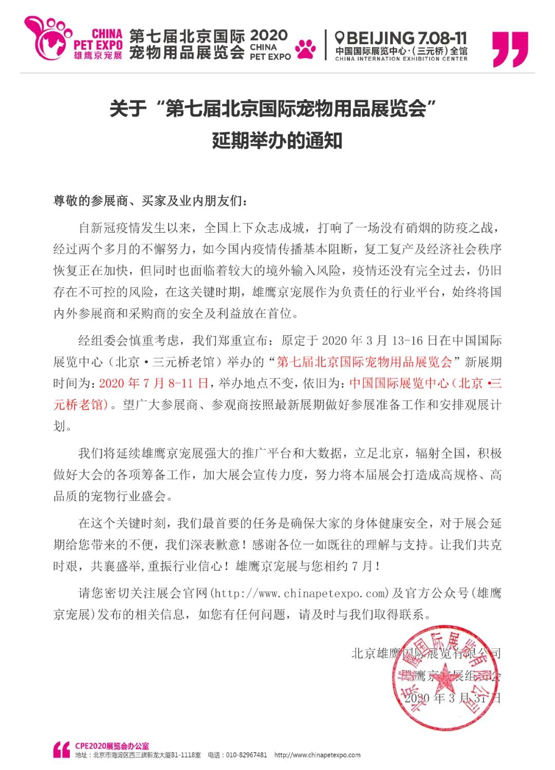 根據(jù)寵物展設(shè)計搭建公司領(lǐng)藝展覽了解到,原定于2020年3月13-16日在中國國際展覽中心(北京·三元橋老館)舉辦的“第七屆北京國際寵物用品展覽會”新展期時間為:2020年7月8-11日,舉辦地點不變,依舊為:中國國際展覽中心(北京·三元橋老館)。如需寵物展設(shè)計請聯(lián)系領(lǐng)藝展覽,希望我們能在寵物展搭建上為您添磚加瓦,祝各位朋友收獲多多,滿載而歸!