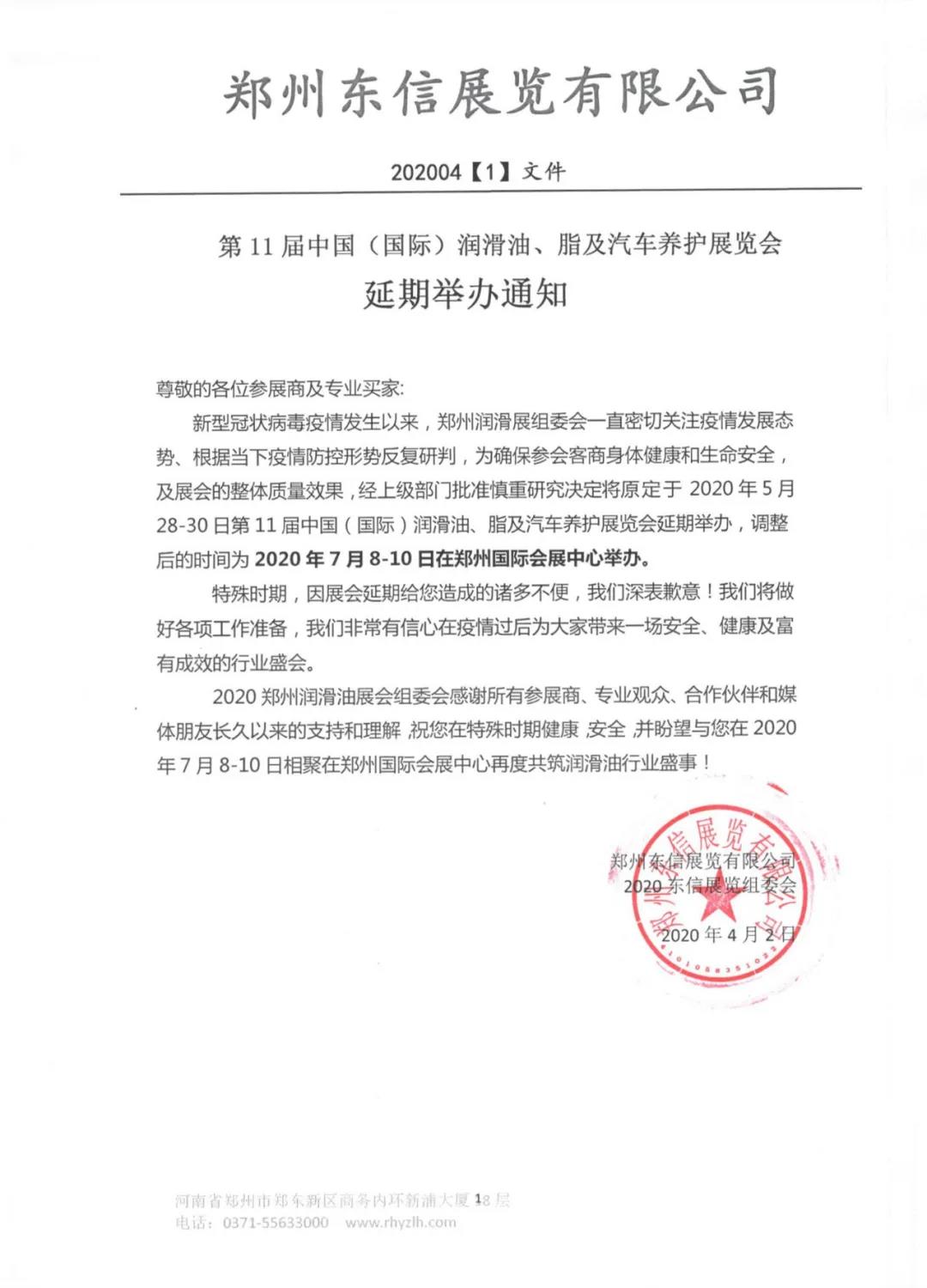根據(jù)潤滑油展設(shè)計(jì)搭建公司領(lǐng)藝展覽了解到,受新冠肺炎疫情影響,原定于2020年5月28-30日舉辦的第11屆中國潤滑油、脂及汽車養(yǎng)護(hù)展覽會(huì)延期至2020年7月8-10日在鄭州國際會(huì)展中心舉辦。如需潤滑油展設(shè)計(jì)請(qǐng)聯(lián)系領(lǐng)藝展覽,希望我們能在潤滑油展搭建上為您添磚加瓦,祝各位朋友收獲多多,滿載而歸!