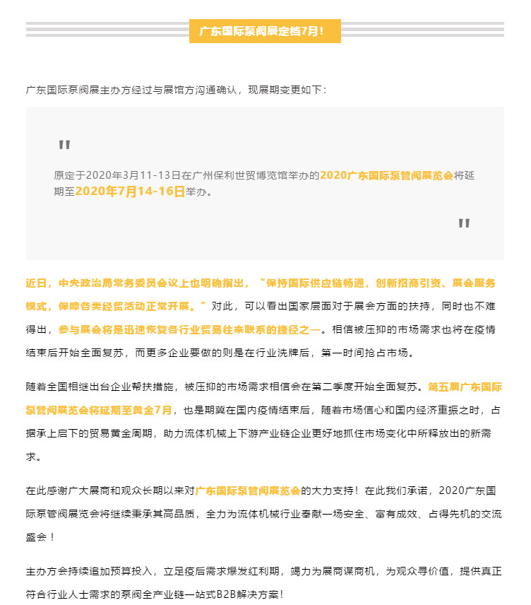 根據(jù)泵閥展設(shè)計(jì)搭建公司領(lǐng)藝展覽了解到,隨著全國相繼出臺(tái)企業(yè)幫扶措施,被壓抑的市場需求相信會(huì)在第二季度開始全面復(fù)蘇。第五屆廣東國際泵管閥展覽會(huì)將延期至黃金7月,也是期冀在國內(nèi)疫情結(jié)束后,隨著市場信心和國內(nèi)經(jīng)濟(jì)重振之時(shí),占據(jù)承上啟下的貿(mào)易黃金周期,助力流體機(jī)械上下游產(chǎn)業(yè)鏈企業(yè)更好地抓住市場變化中所釋放出的新需求。如需泵閥展設(shè)計(jì)請聯(lián)系領(lǐng)藝展覽,希望我們能在泵閥展搭建上為您添磚加瓦,祝各位朋友收獲多多,滿載而歸!