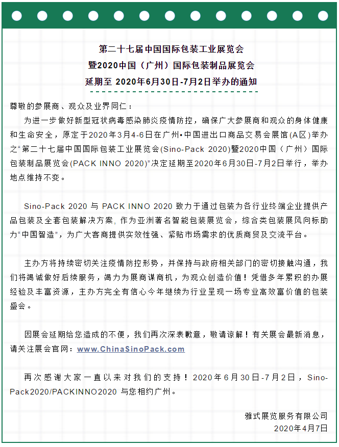 根據包裝展設計搭建公司領藝展覽了解到,原定于2020年3月4-6日在廣州?中國進出口商品交易會展館(A區(qū))舉辦之“第二十七屆中國國際包裝工業(yè)展覽會(Sino-Pack 2020)暨2020中國(廣州)國際包裝制品展覽會(PACK INNO 2020)”決定延期至2020年6月30日-7月2日舉行,舉辦地點維持不變。如需包裝展設計請聯系領藝展覽,希望我們能在包裝展搭建上為您添磚加瓦,祝各位朋友收獲多多,滿載而歸!