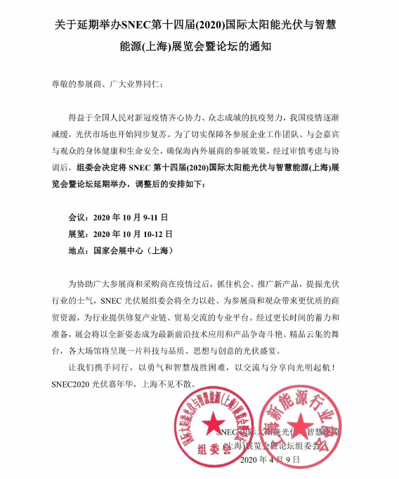 根據(jù)光伏展設(shè)計(jì)搭建公司領(lǐng)藝展覽了解到,SNEC第十四屆(2020)國(guó)際太陽能光伏與智慧能源(上海)展覽會(huì)暨論壇延期至2020年10月10-12日舉行。如需光伏展設(shè)計(jì)請(qǐng)聯(lián)系領(lǐng)藝展覽,希望我們能在光伏展搭建上為您添磚加瓦,祝各位朋友收獲多多,滿載而歸!