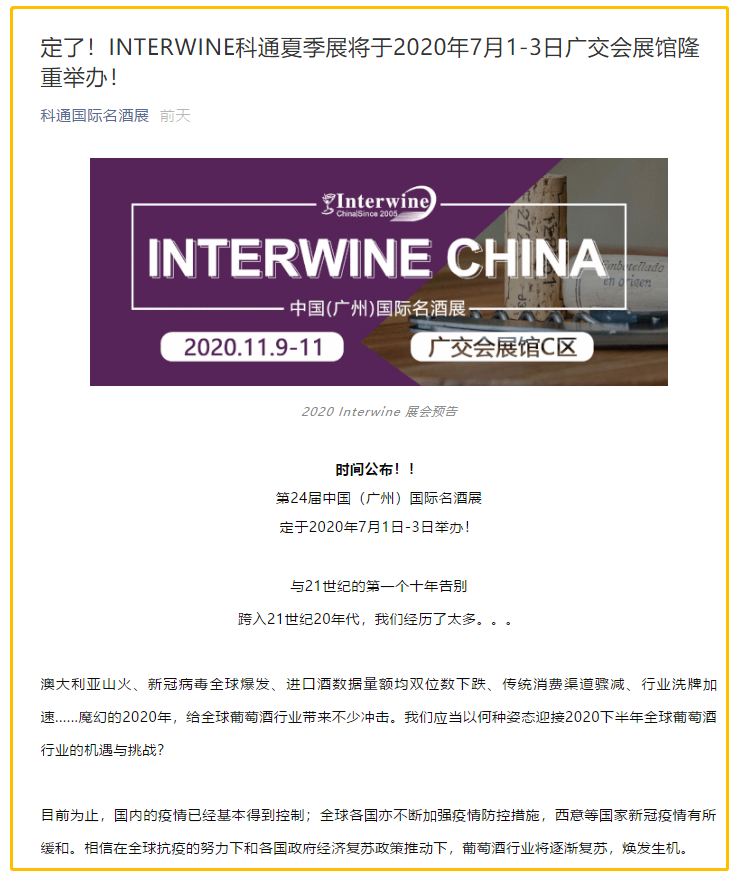 根據(jù)名酒展設(shè)計(jì)搭建公司領(lǐng)藝展覽了解到,INTERWINE科通夏季展將于2020年7月1-3日廣交會(huì)展館隆重舉辦!如需名酒展設(shè)計(jì)請(qǐng)聯(lián)系領(lǐng)藝展覽,希望我們能在名酒展搭建上為您添磚加瓦,祝各位朋友收獲多多,滿載而歸!