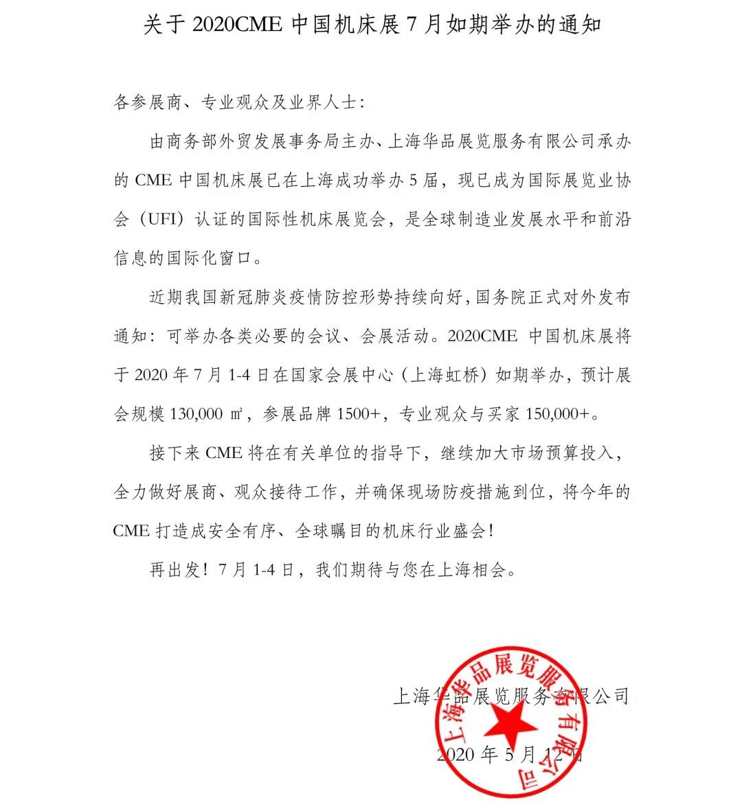 上海機床展設計搭建公司領藝展覽了解到,原定于2020年2月25日舉行的CME中國機床展將延期至2020年7月1-4日舉行。如需上海機床展設計請聯系領藝展覽,希望我們能在上海機床展搭建上為您添磚加瓦,祝各位朋友收獲多多,滿載而歸!