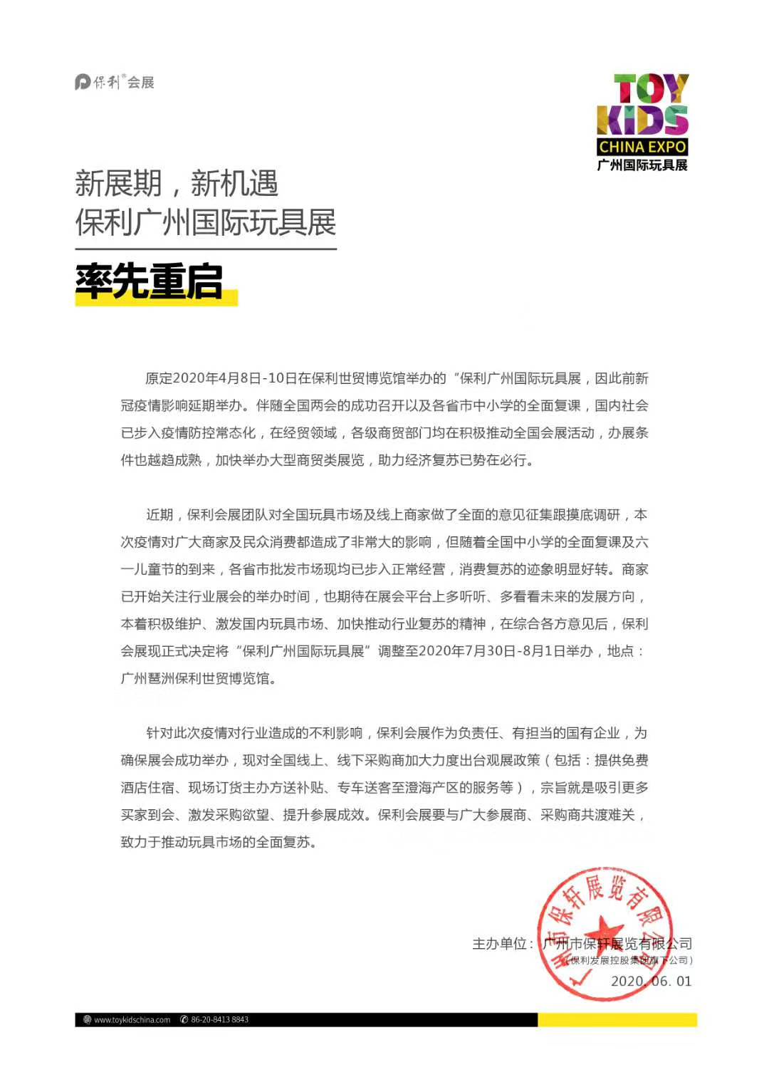 廣州玩具展設(shè)計(jì)搭建公司領(lǐng)藝展覽了解到,原定于2020年4月8日舉行的“保利廣州國際玩具展”調(diào)整至2020年7月30日-8月1日舉行。如需廣州玩具展設(shè)計(jì)請(qǐng)聯(lián)系領(lǐng)藝展覽,希望我們能在廣州玩具展搭建上為您添磚加瓦,祝各位朋友收獲多多,滿載而歸!