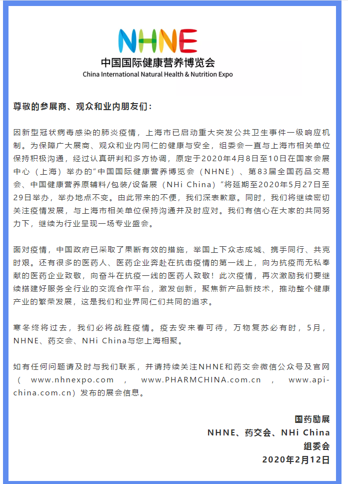 因新型冠狀病毒感染的肺炎疫情,上海市已啟動(dòng)重大突發(fā)公共衛(wèi)生事件一級(jí)響應(yīng)機(jī)制。為保障廣大展商、觀眾和業(yè)內(nèi)同仁的健康與安全,原定于2020年4月8日至10日在國(guó)家會(huì)展中心(上海)舉辦的“中國(guó)國(guó)際健康營(yíng)養(yǎng)博覽會(huì)(NHNE)、第83屆全國(guó)藥品交易會(huì)、中國(guó)健康營(yíng)養(yǎng)原輔料/包裝/設(shè)備展(NHi China)”將延期至2020年5月27日至29日舉辦,舉辦地點(diǎn)不變。我們將繼續(xù)密切關(guān)注展會(huì)動(dòng)態(tài),希望我們能在上海健康展搭建上為您添磚加瓦,祝各位朋友收獲多多,滿載而歸!上海健康展設(shè)計(jì)搭建公司領(lǐng)藝展覽向奮斗在抗疫一線的醫(yī)藥人致敬!期待5月,NHNE、藥交會(huì)、NHi China與您上海相聚!