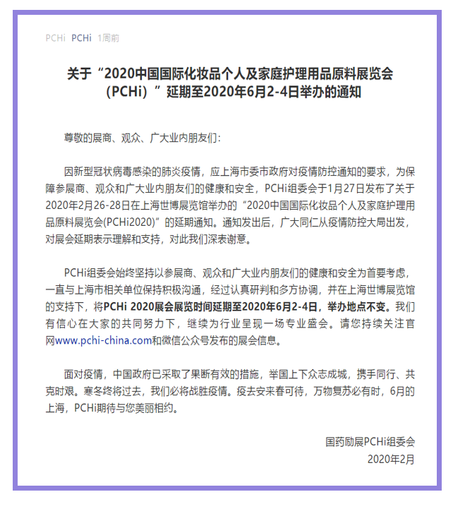 根據(jù)上海家庭護(hù)理展設(shè)計(jì)搭建公司領(lǐng)藝展覽了解到,因新型冠狀病毒感染的肺炎疫情,應(yīng)上海市委市政府對疫情防控通知的要求,為保障參展商、觀眾和廣大業(yè)內(nèi)朋友們的健康和安全,PCHi組委會(huì)于1月27日發(fā)布了關(guān)于2020年2月26-28日在上海世博展覽館舉辦的“2020中國國際化妝品個(gè)人及家庭護(hù)理用品原料展覽會(huì)(PCHi2020)”的延期通知。將PCHi 2020展會(huì)展覽時(shí)間延期至2020年6月2-4日,舉辦地點(diǎn)不變。我們將繼續(xù)密切關(guān)注展會(huì)動(dòng)態(tài),希望我們能在上海家庭護(hù)理展搭建上為您添磚加瓦,祝各位朋友收獲多多,滿載而歸!嚴(yán)寒終將過去,春天必將來臨。上海家庭護(hù)理展設(shè)計(jì)搭建公司領(lǐng)藝展覽向抗疫一線的所有英雄致敬!