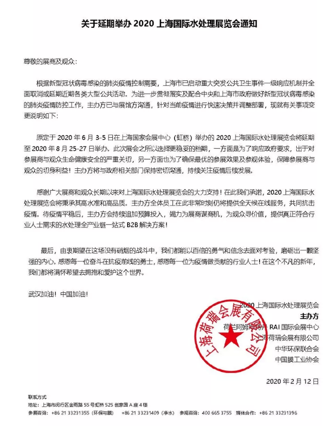 為全力支持打贏疫情防控阻擊戰(zhàn),貫徹落實上海市疫情防控工作領(lǐng)導小組的防疫工作指導方針,切實保障廣大展商和觀眾的身體健康和安全,確保展覽會的展示和觀展效果,原定于2020年6月3-5日在上海國家會展中心(虹橋)舉辦的2020上海國際水處理展覽會將延期至2020年8月25-27日舉辦。我們將繼續(xù)密切關(guān)注展會動態(tài),希望我們能在上海水展搭建上為您添磚加瓦。!上海水展設(shè)計搭建公司領(lǐng)藝展覽在此非常時刻仍將提供全天候在線服務(wù),共同抗擊疫情。預(yù)祝各位朋友收獲多多,滿載而歸!