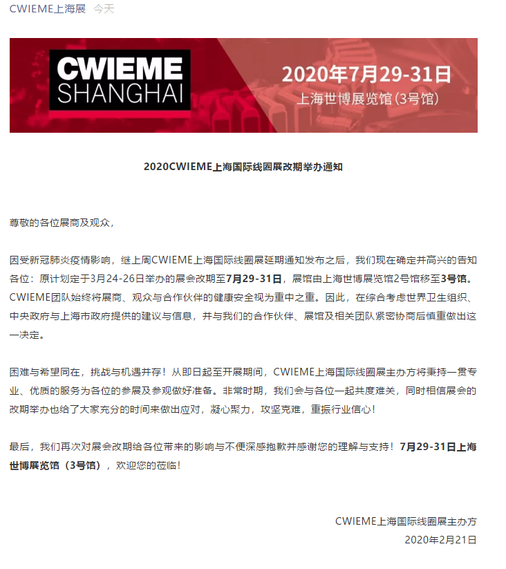 根據(jù)上海線(xiàn)圈展設(shè)計(jì)搭建公司領(lǐng)藝展覽了解到,因受新冠肺炎疫情影響,繼上周CWIEME上海國(guó)際線(xiàn)圈展延期通知發(fā)布之后,原計(jì)劃定于3月24-26日舉辦的展會(huì)改期至7月29-31日。如需線(xiàn)圈展設(shè)計(jì)請(qǐng)聯(lián)系領(lǐng)藝展覽,希望我們能在線(xiàn)圈展搭建上為您添磚加瓦,祝各位朋友收獲多多,滿(mǎn)載而歸!