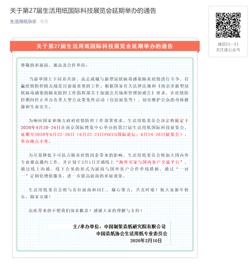 根據(jù)南京紙展設(shè)計(jì)搭建公司領(lǐng)藝展覽解到,為響應(yīng)國家和地方政府疫情防控工作部署要求,生活用紙委員會決定將原定于2020年4月20-24日在南京國際博覽中心舉辦的第27屆生活用紙國際科技展覽會,延期至2020年6月22-26日(6月22-23日FOCUS國際論壇;6月24-26日展覽會),舉辦地點(diǎn)不變。如需南京紙展設(shè)計(jì)請聯(lián)系領(lǐng)藝展覽,希望我們能在南京紙展搭建上為您添磚加瓦,祝各位朋友收獲多多,滿載而歸!