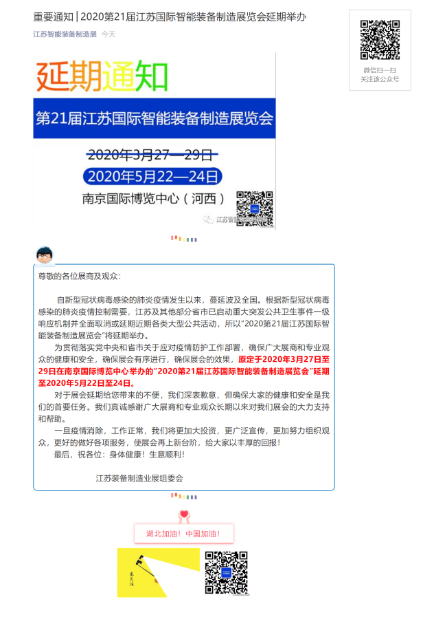 根據(jù)智能裝備展設(shè)計(jì)搭建公司領(lǐng)藝展覽解到,為貫徹落實(shí)黨中央和省市關(guān)于應(yīng)對(duì)疫情防護(hù)工作部署,確保廣大展商和專業(yè)觀眾的健康和安全,確保展會(huì)有序進(jìn)行,確保展會(huì)的效果,原定于2020年3月27日至29日在南京國際博覽中心舉辦的“2020第21屆江蘇國際智能裝備制造展覽會(huì)”延期至2020年5月22日至24日。如需智能裝備展設(shè)計(jì)請(qǐng)聯(lián)系領(lǐng)藝展覽,希望我們能在智能裝備展搭建上為您添磚加瓦,祝各位朋友收獲多多,滿載而歸!