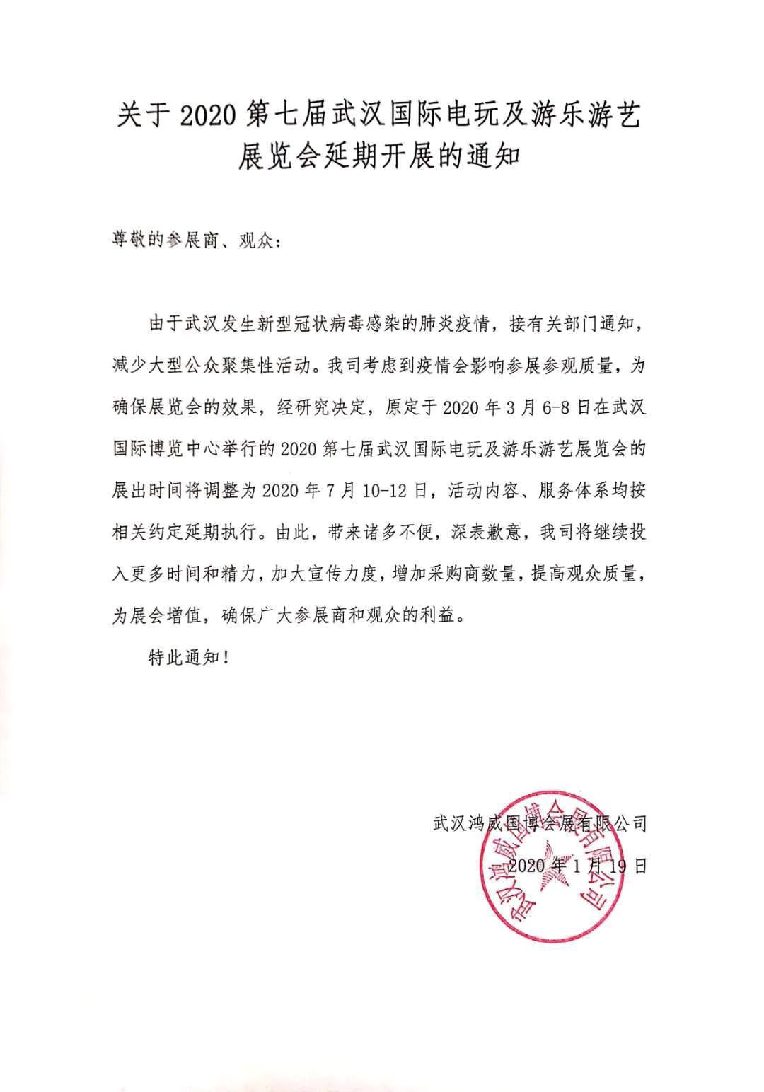 根據(jù)武漢電玩游樂設備展設計搭建公司領藝展覽解到,鑒于目前全國發(fā)生“新型冠狀病毒感染肺炎”疫情,為了積極響應及配合疫情防控工作,確保各參會人士的安全與健康,并保證參會效果,原定于2020年3月6日-8 日在武漢國際博覽中心舉辦的2020第七屆武漢國際電玩及游樂游藝展覽會將正式延期至2020年7月10日-12日舉辦地點維持不變。如需武漢電玩游樂設備展設計請聯(lián)系領藝展覽,希望我們能在武漢電玩游樂設備展搭建上為您添磚加瓦,祝各位朋友收獲多多,滿載而歸!