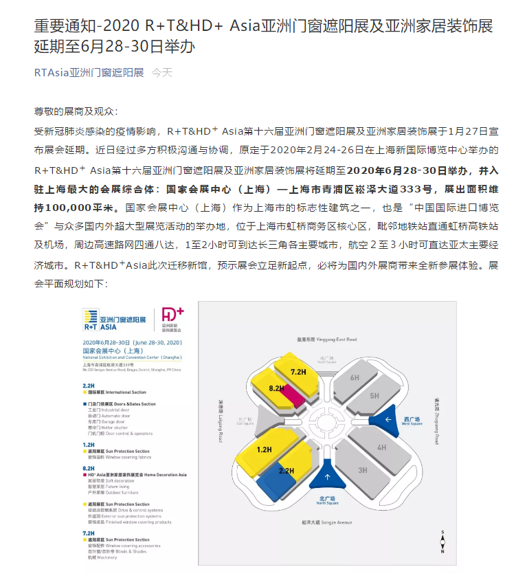 根據(jù)亞洲門窗遮陽展設(shè)計(jì)搭建公司領(lǐng)藝展覽解到,受新冠肺炎感染的疫情影響,R+T&HD+ Asia第十六屆亞洲門窗遮陽展及亞洲家居裝飾展于1月27日宣布展會延期。近日經(jīng)過多方積極溝通與協(xié)調(diào),原定于2020年2月24-26日在上海新國際博覽中心舉辦的R+T&HD+ Asia第十六屆亞洲門窗遮陽展及亞洲家居裝飾展將延期至2020年6月28-30日舉辦,并入駐上海最大的會展綜合體:國家會展中心(上海)—上海市青浦區(qū)崧澤大道333號,展出面積維持100,000平米。如需亞洲門窗遮陽展設(shè)計(jì)請聯(lián)系領(lǐng)藝展覽,希望我們能在亞洲門窗遮陽展搭建上為您添磚加瓦,祝各位朋友收獲多多,滿載而歸!