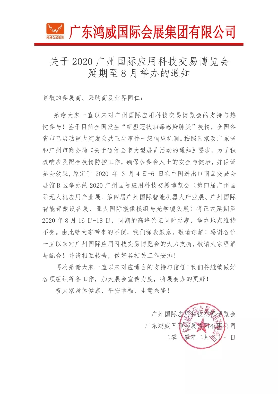 根據(jù)應用科技展設計搭建公司領藝展覽解到,鑒于目前全國發(fā)生“新型冠狀病毒感染肺炎”疫情,全國各省市已啟動重大突發(fā)公共衛(wèi)生事件一級響應機制。按照國家及廣東省和廣州市商務局《關于暫停全市大型展覽活動的通知》要求,為了積極響應及配合疫情防控工作,確保各參會人士的安全與健康,并保證參會效果,原定于2020年3月4日-6日在中國進出口商品交易會展館B區(qū)舉辦的2020廣州國際應用科技交易博覽會(第四屆廣州國際無人機應用產(chǎn)業(yè)展、第四屆廣州國際智能機器人產(chǎn)業(yè)展、廣州國際智能穿戴設備展、亞太國際攝像模組與光學鏡頭展)將正式延期至2020年8月16日-18日,同期的高峰論壇同時延期,舉辦地點維持不變。如需應用科技展設計請聯(lián)系領藝展覽,希望我們能在應用科技展搭建上為您添磚加瓦,祝各位朋友收獲多多,滿載而歸!