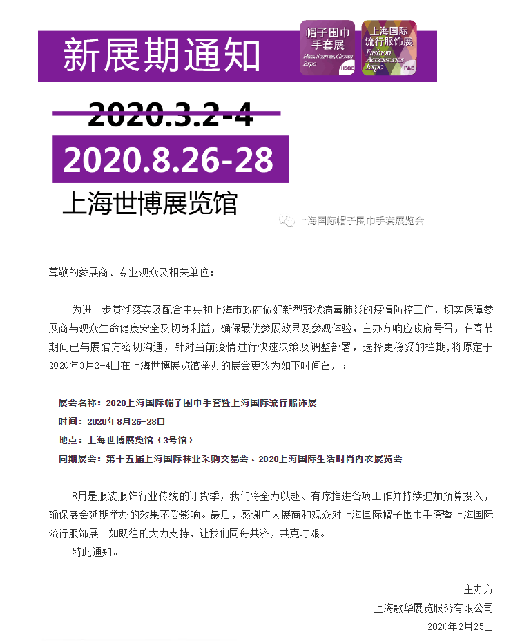 根據(jù)上海國際帽子圍巾手套服裝展設(shè)計搭建公司領(lǐng)藝展覽了解到,為進一步貫徹落實及配合中央和上海市政府做好新型冠狀病毒肺炎的疫情防控工作,切實保障參展商與觀眾生命健康安全及切身利益,確保最優(yōu)參展效果及參觀體驗,主辦方響應(yīng)政府號召,在春節(jié)期間已與展館方密切溝通,針對當(dāng)前疫情進行快速決策及調(diào)整部署,選擇更穩(wěn)妥的檔期,將原定于2020年3月2-4日在上海世博展覽館舉辦的展會更改2020年8月26-28日召開,如需服飾展設(shè)計請聯(lián)系領(lǐng)藝展覽,希望我們能在服裝展搭建上為您添磚加瓦,祝各位朋友收獲多多,滿載而歸!