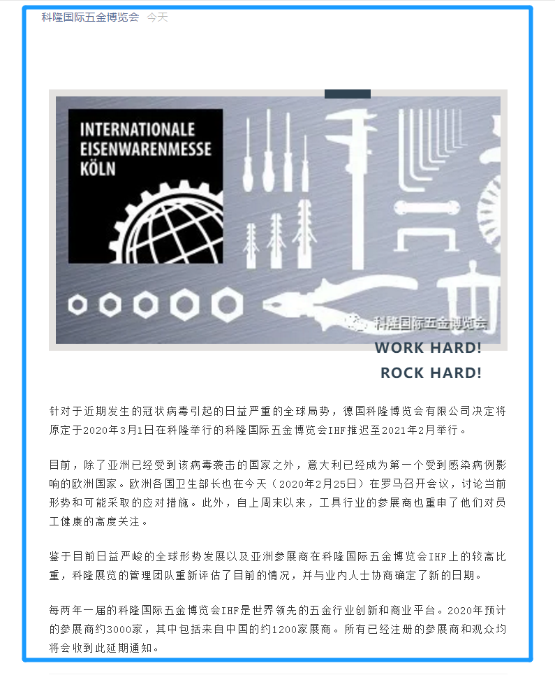 目前,除了亞洲已經(jīng)受到該病毒襲擊的國家之外,意大利已經(jīng)成為第一個受到感染病例影響的歐洲國家。歐洲各國衛(wèi)生部長也在今天(2020年2月25日)在羅馬召開會議,討論當前形勢和可能采取的應(yīng)對措施。此外,自上周末以來,工具行業(yè)的參展商也重申了他們對員工健康的高度關(guān)注。鑒于目前日益嚴峻的全球形勢發(fā)展以及亞洲參展商在科隆國際五金博覽會IHF上的較高比重,科隆展覽的管理團隊重新評估了目前的情況,并與業(yè)內(nèi)人士協(xié)商確定了新的日期。每兩年一屆的科隆國際五金博覽會IHF是世界領(lǐng)先的五金行業(yè)創(chuàng)新和商業(yè)平臺。2020年預(yù)計的參展商約3000家,其中包括來自中國的約1200家展商。所有已經(jīng)注冊的參展商和觀眾均將會收到此延期通知。如需五金展設(shè)計請聯(lián)系領(lǐng)藝展覽,希望我們能在五金展搭建上為您添磚加瓦,祝各位朋友收獲多多,滿載而歸!