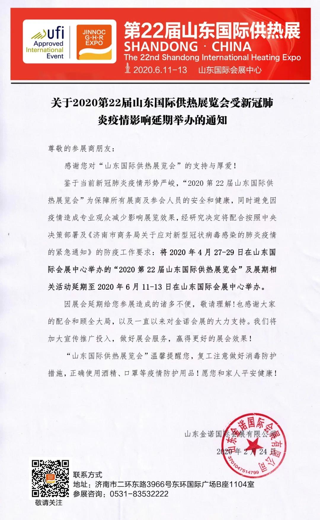 根據(jù)供熱展設計搭建公司領(lǐng)藝展覽了解到,受新冠病毒感染的肺炎疫情影響,第22屆山東國際供熱展延期至6月11到13日在濟南盛大召開。如需供熱展設計請聯(lián)系領(lǐng)藝展覽,希望我們能在供熱展搭建上為您添磚加瓦,祝各位朋友收獲多多,滿載而歸!