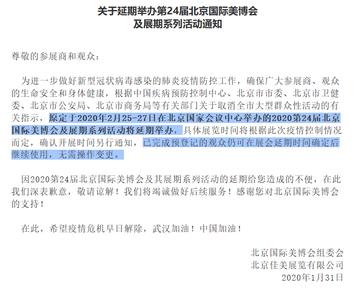 為進一步做好新型冠狀病毒感染的肺炎疫情防控工作,確保廣大參展商、觀眾的生命安全和身體健康,根據中國疾病預防控制中心、北京市市委、北京市衛(wèi)健委、北京市公安局、北京市商務局等有關部門關于取消全市大型群眾性活動的有關指示,原定于2020年2月25-27日在北京國家會議中心舉辦的2020第24屆北京國際美博會及展期系列活動將延期舉辦,具體展覽時間將根據此次疫情控制情況而定,確認開展時間另行通知,已完成預登記的觀眾仍可在展會延期時間確定后繼續(xù)使用,無需操作變更。如需北京美博會設計請聯(lián)系領藝展覽,希望我們能在北京美博會搭建上為您添磚加瓦,祝各位朋友收獲多多,滿載而歸!