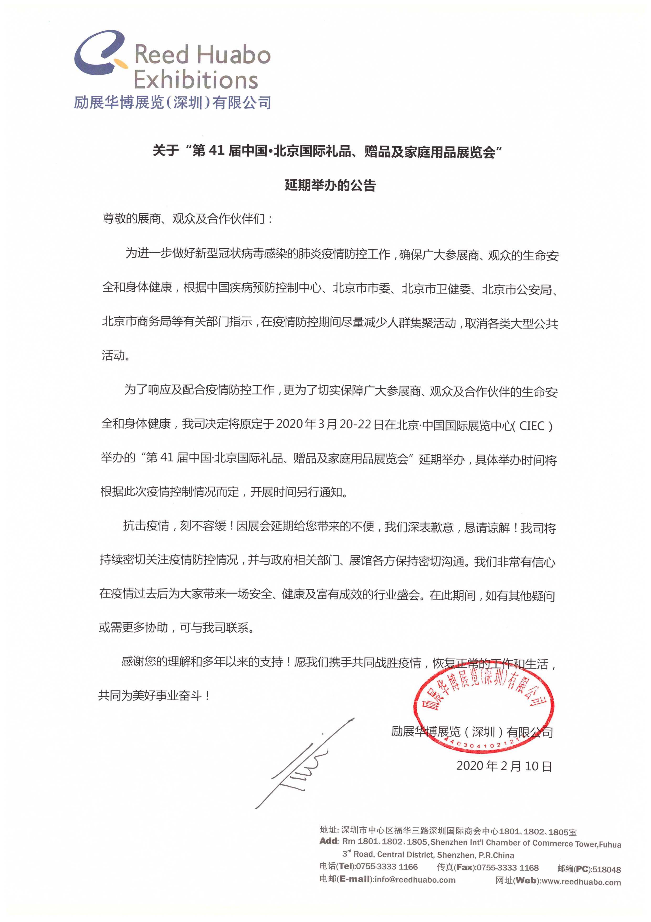 為進(jìn)一步做好新型冠狀病毒感染的肺炎疫情防控工作,確保廣大參展商、觀眾的生命安全和身體健康,根據(jù)中國疾病預(yù)防控制中心、北京市市委、北京市衛(wèi)委、北京市公安局、北京市商務(wù)局等有關(guān)部門指示,在疫情防控期間盡量減少人群集聚活動,取消各類大型公共活動。